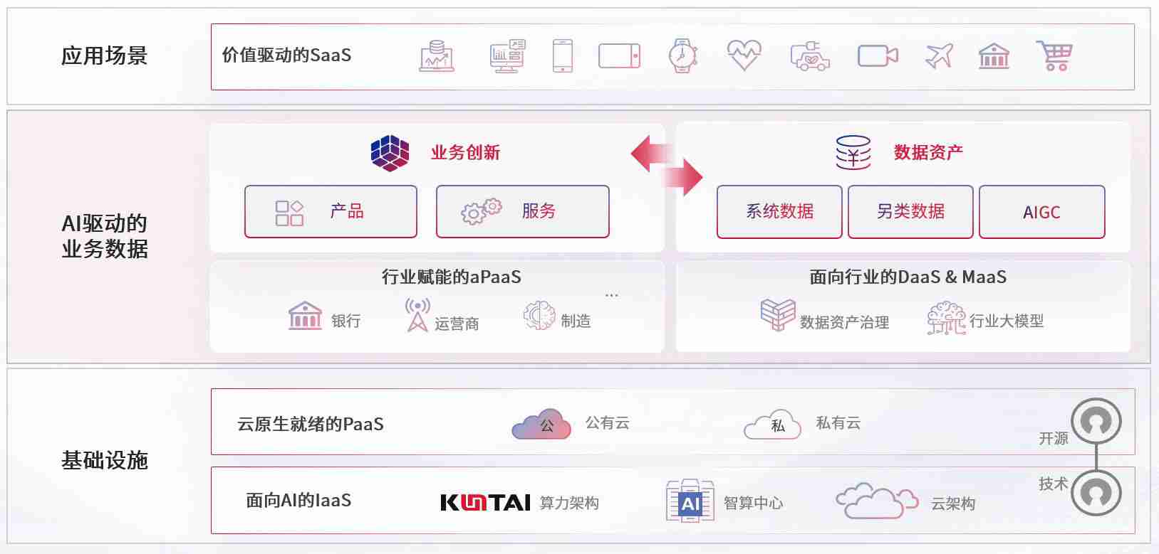 数字时代,,围绕企业数字化转型的关键要素,,,AG尊龙数码开创性的提出数云融合战略和技术体系框架,,,,着力在云原生、、、数字原生、、、AI原生和信创产业上架构产品和服务能力,,,为处在不同数字化转型阶段的快消零售、、、汽车、、金融、、医疗、、、政企、、教育、、运营商等行业客户提供泛在的敏捷IT能力和融合的数据驱动能力,,构建跨界融合创新的数字业务场景和新业务模式,,,助力企业级客户建立面向未来的核心能力和竞争优势,,,全面推动社会的数字化、、、、智能化转型升级。。